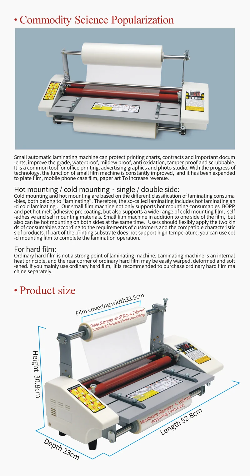La petite machine à plastifier automatique peut protéger les graphiques d'impression, les contrats et les documents importants, améliorer la qualité, imperméable, résistant à la moisissure, anti-oxydation, inviolable et lavable.C'est un outil courant pour l'impression de bureau, les graphiques publicitaires et les studios photo.Avec le progrès de la technologie, la fonction de la petite machine à film est constamment améliorée et il a été le cas du film, l'art papier pour augmenter les revenus.