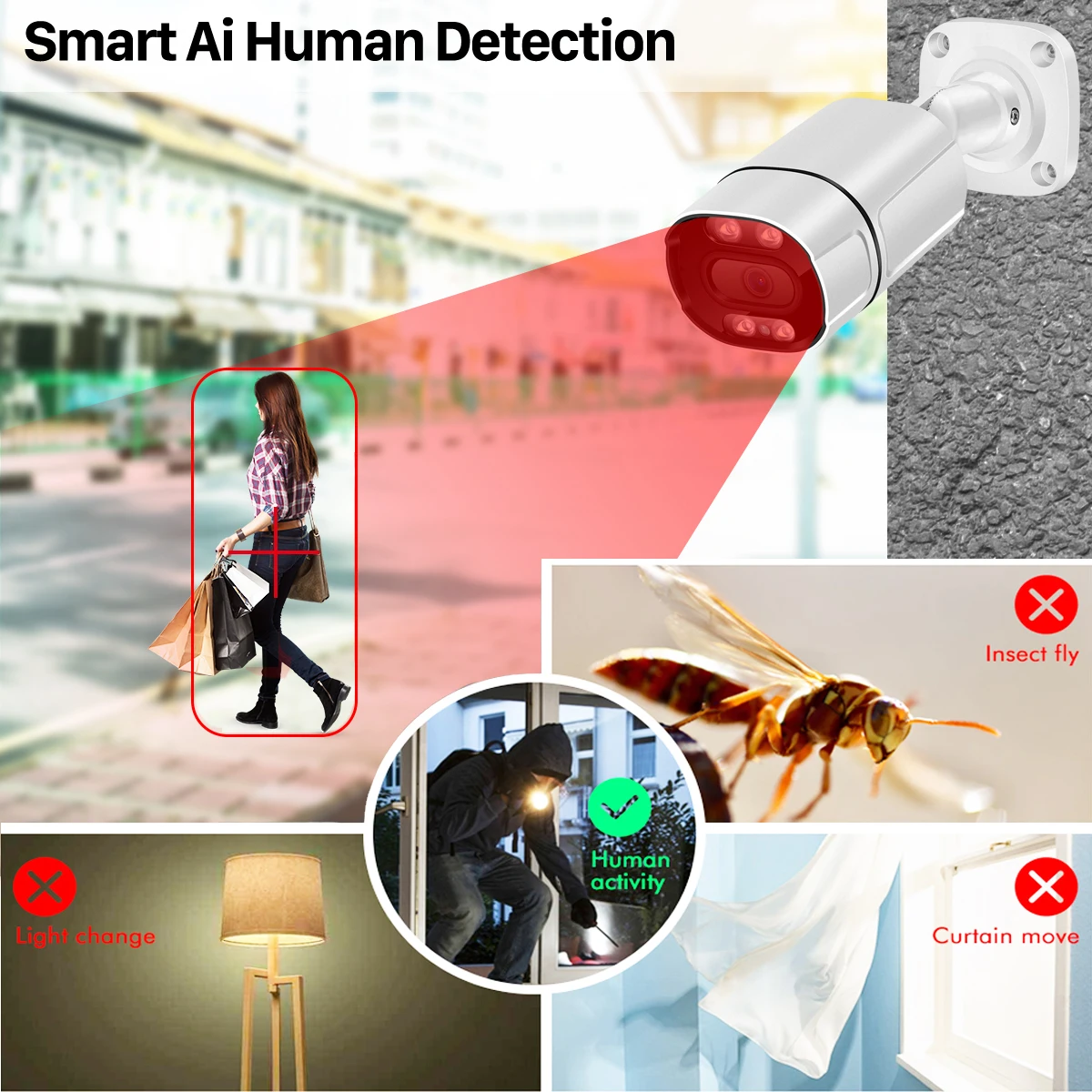 ● Support Light Alarm & Voice Alarm : set smart alarm night mode for the camera in Ai mode ,when it defects human at night ,its white Light will turn on ; Voice DIY make it says something when it detects movement to force the Intruder leave your house ;