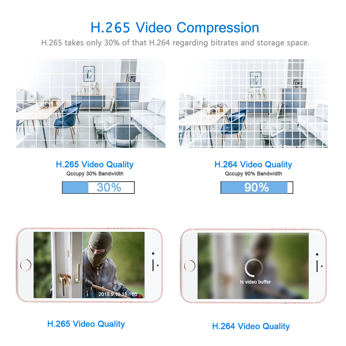 H.265 takes only 30% of that H.264 regarding bitrates and storage space