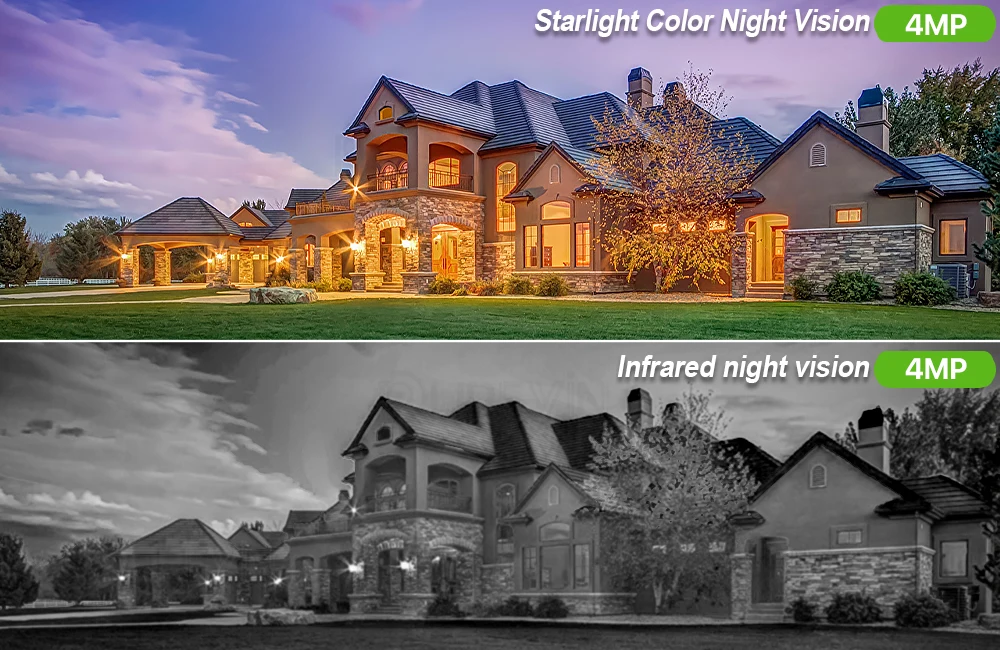 4MP image has more exquisite,better light saturation,lower noise and other advantages,color night vision is up to 10m, allowing you to see what you need. Whether it is someone sneaking in at midnight or a raccoon's break-in, all will be captured by the camera in close-up detail.