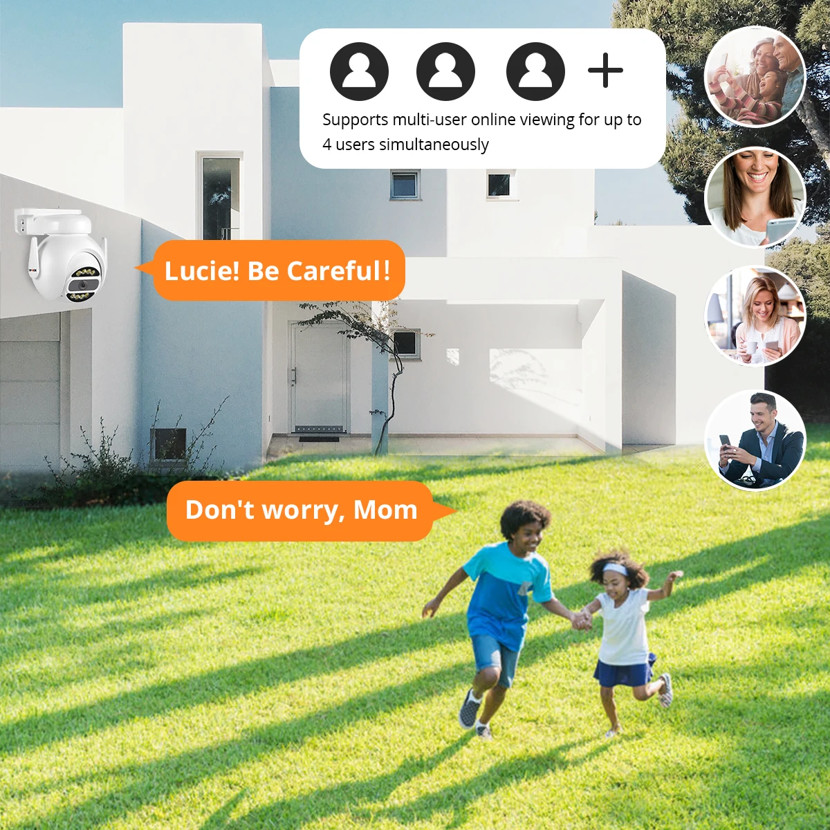 Visualisation en ligne multi-utilisateursCette caméra extérieure prend en charge la visualisation en ligne multi-utilisateurs, afin que vous puissiez partager quelques moments avec votre famille via l'application.De plus, l'image 4 en 1 vous permet également de visualiser 4 caméras de surveillance sur un seul écran, ce qui permet de voir facilement chaque coin de votre maison.