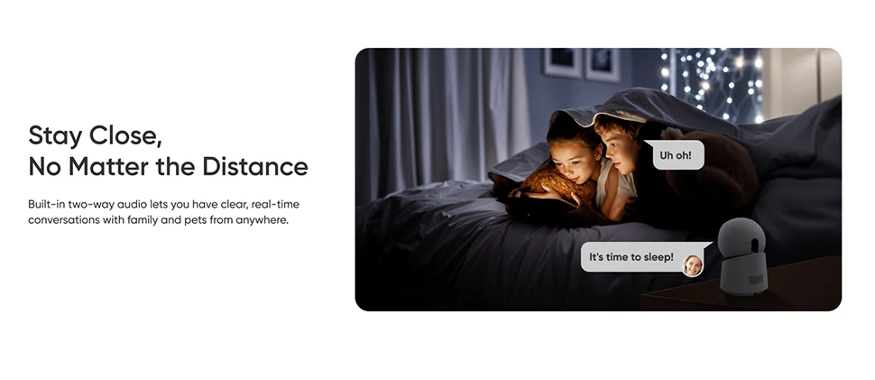 L'audio bidirectionnel intégré vous permet d'avoir des conversations claires et en temps réel avec votre famille et vos animaux de compagnie depuis n'importe où.