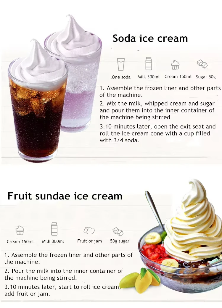 1. Wash and dry the inner container before use, and put it in the freezer for more than 10 hours (the lower the temperature, the better the production effect, and it is recommended that the freezer temperature be adjusted to -18 degrees or above).