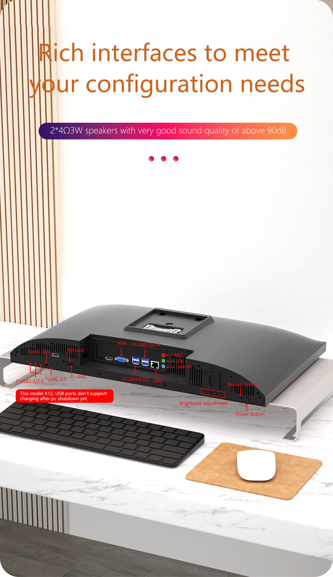 DC, sortie HDMI, VGA/COM/DP, USB2.0/3.0 *4, RJ45, entrée micro, sortie ligne