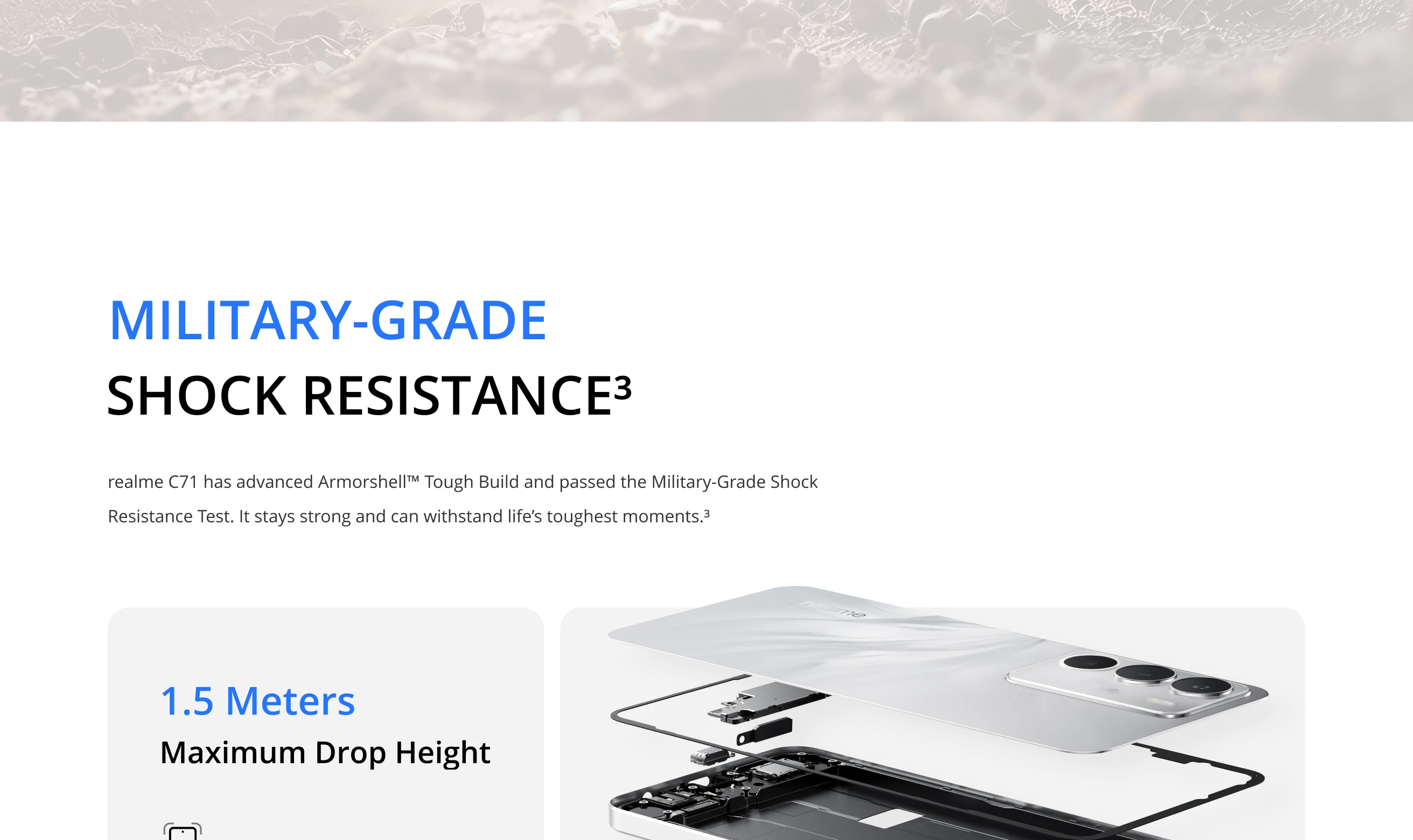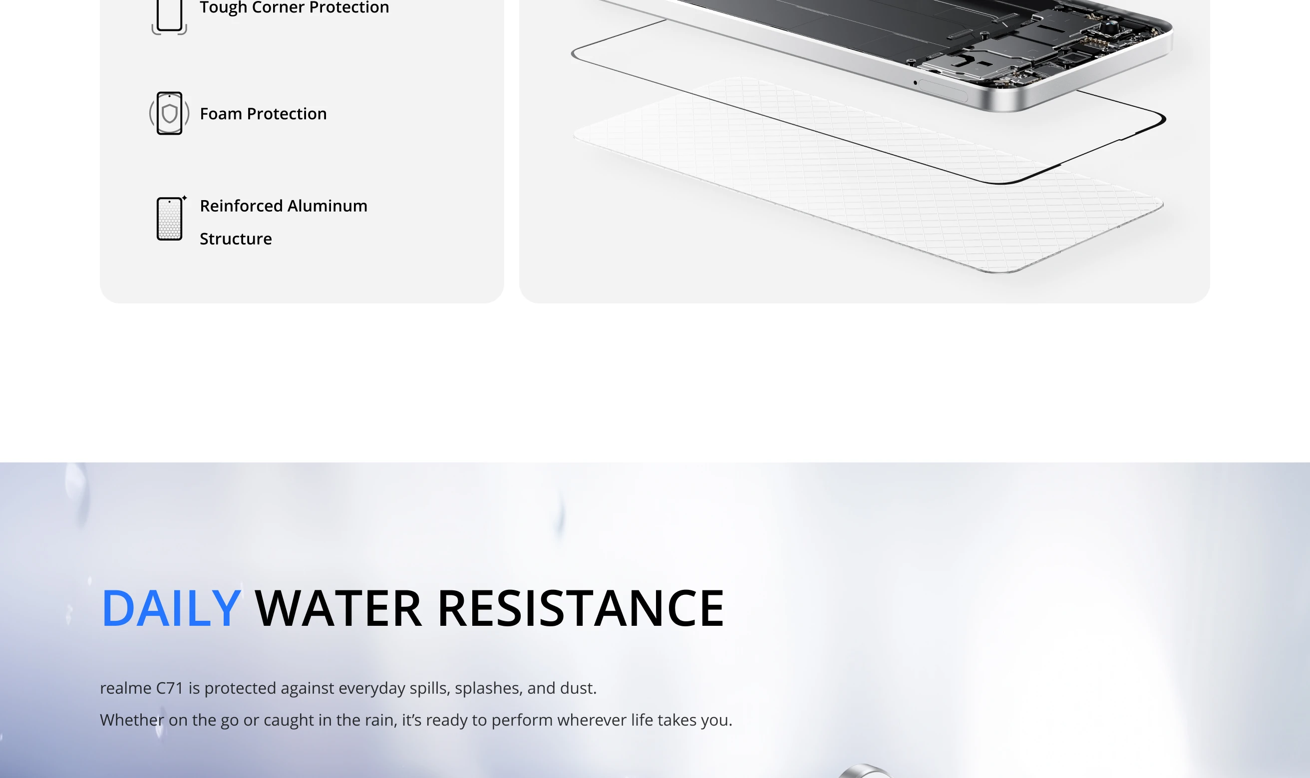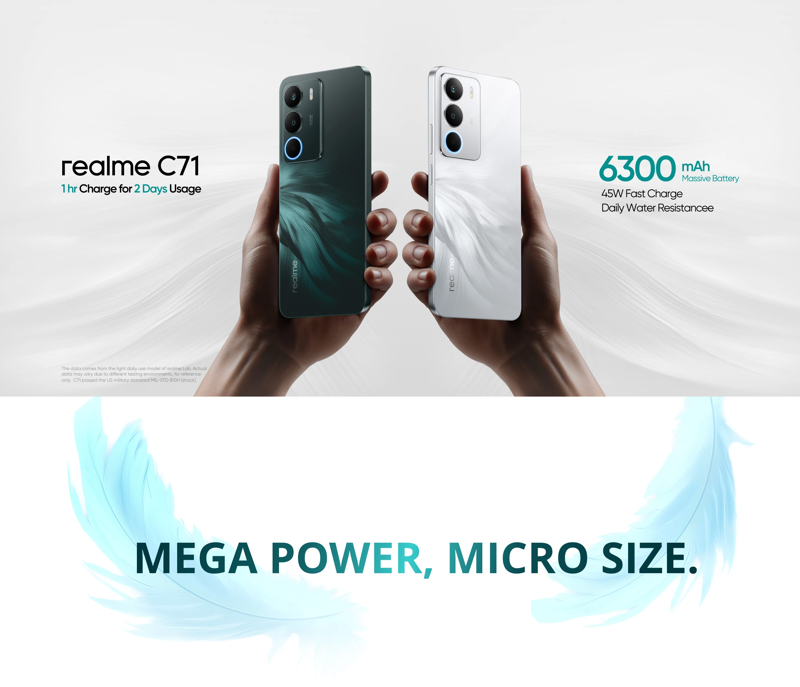 realme C71*1, câble USB Type-C*1, adaptateur secteur 45 W*1, étui de protection*1, aiguille pour carte SIM*1, guide rapide*1, livret d'informations importants avec carte de garantie*1