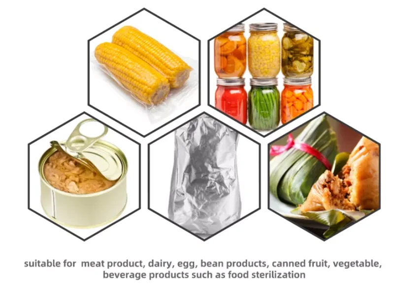 La machine à cornue stérilisatrice est utilisée pour les conserves, les boissons, les conserves en fer blanc, les champignons enoki, le maïs, les œufs de canard, les pousses de bambou, la rosée d'amande, les boulettes de riz, les champignons en conserve, la bouillie à huit trésors, oeufs séchés, tofu séché, sauce à la viande en conserve, poisson en conserve, sacs d'emballage de produits à base de viande, Produits à base de soja et autres produits.