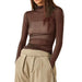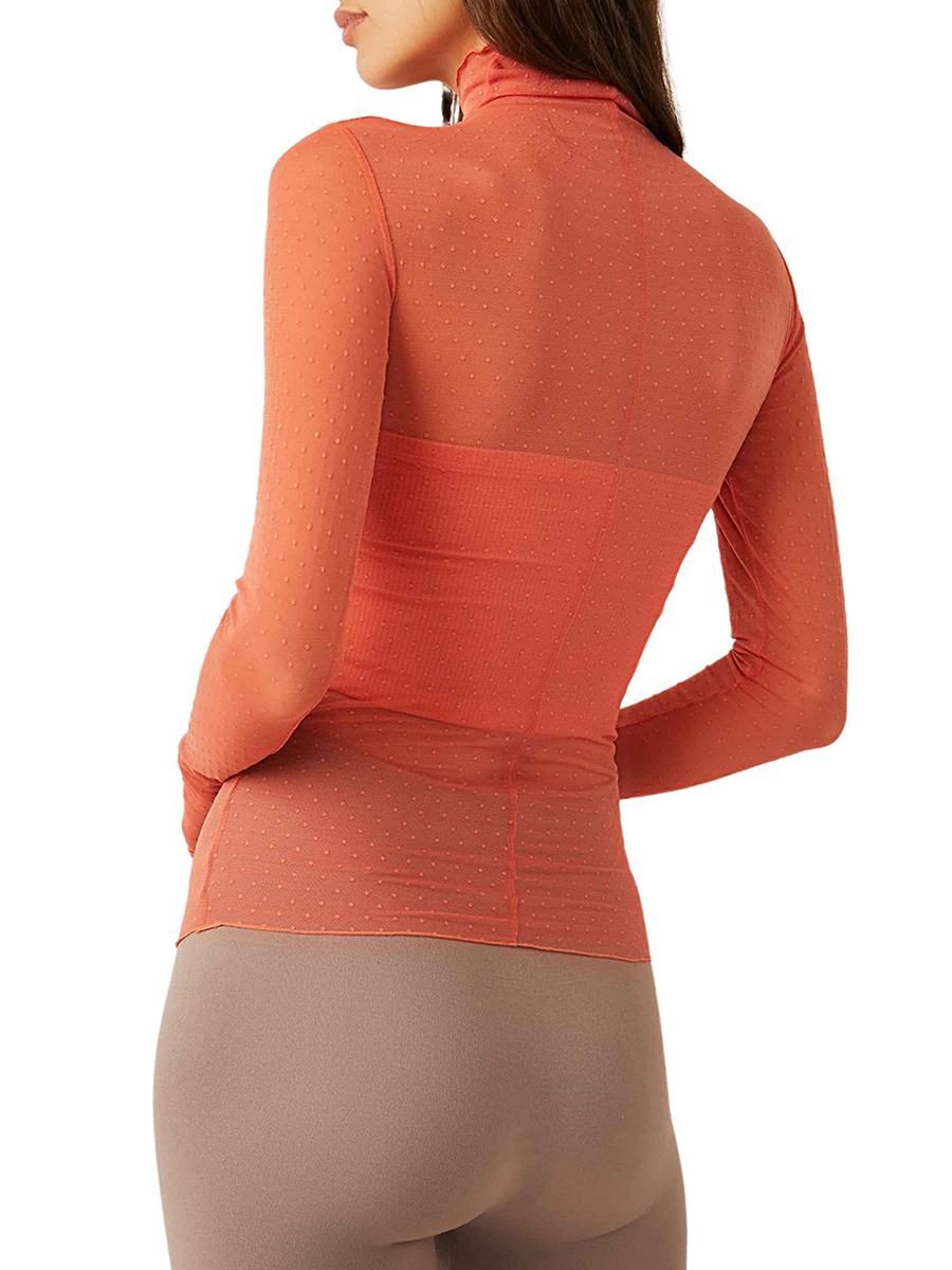 T-shirt pour femmes, col roulé à manches longues à pois suisses transparents Slim Fit Sheer Tops Clubwear