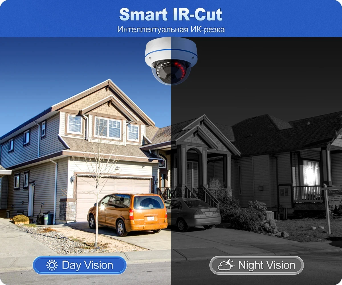 Le filtre intelligent IR-Cut commute automatiquement entre le jour et la nuit pour réduire la diffusion des couleurs pendant la journée et améliorer la luminosité de l'image la nuit en vous assurant d'obtenir des images de surveillance vives de l'aube à l'obscurité