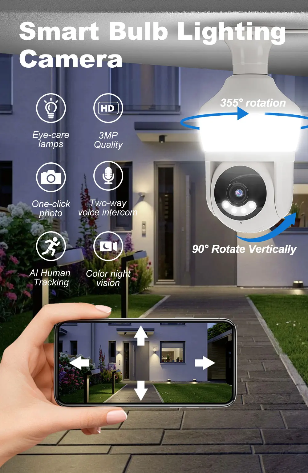 Tuya E27 ampoule WiFi caméra 5MP intérieur 5x Zoom double écran PTZ caméra de sécurité IR couleur Vision nocturne Surveillance sans fil