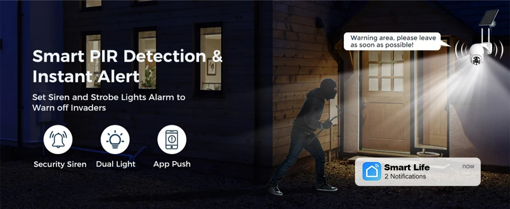 Si votre application est activée : PIR + filtrage du corps humain + sensibilité d'alarme élevée », la caméra aura une alarme vocale + sirène : « Vous avez pénétré dans la zone de surveillance, veuillez partir immédiatement » + Son de sirène »
