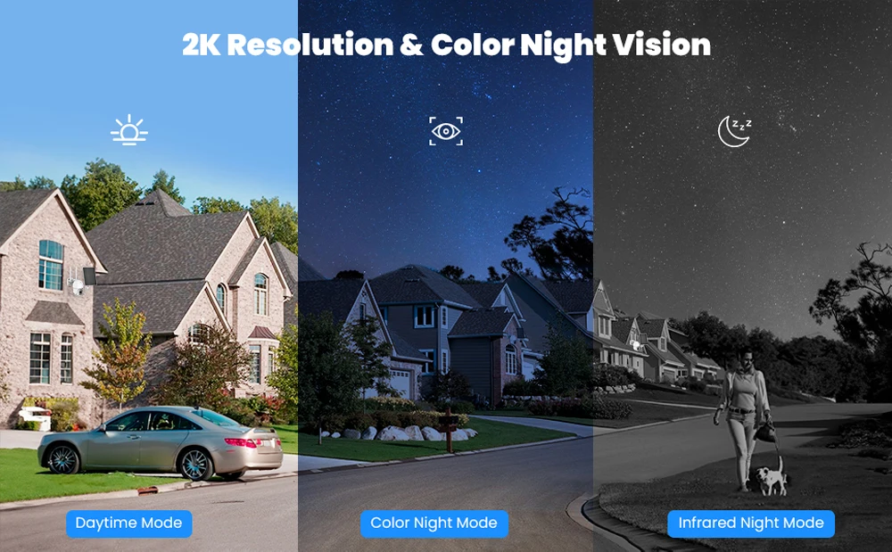 Prise en charge du mode intelligent + du mode infrarouge + de la vision nocturne en mode lumière colorée, cette caméra solaire 4 LED infrarouges intégrées + 4 LED de lumière blanche capturent des vidéos claires la nuit, les LED de vision nocturne infrarouge à l'intérieur pour voir jusqu'à 36 pieds dans l'obscurité totale à la nuit, enregistrez une vidéo cristalline Full HD 3MP 1080P avec filigrane date/heure, restez en sécurité avec une sécurité domestique intérieure et extérieure non-stop fiable et claire 24h/24 et 7j/