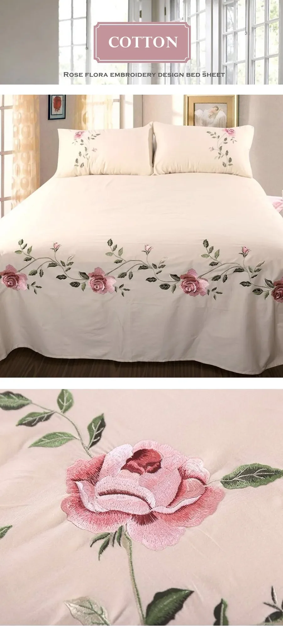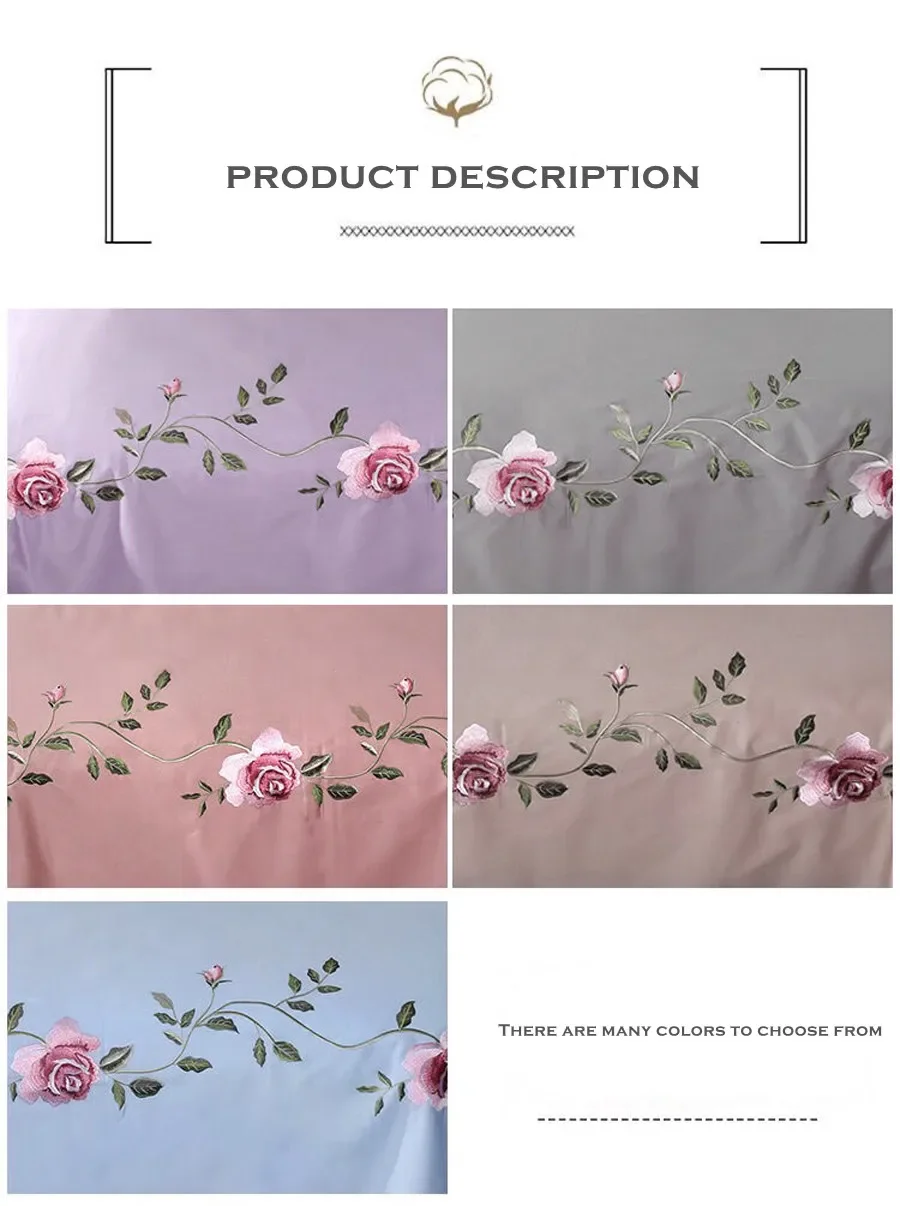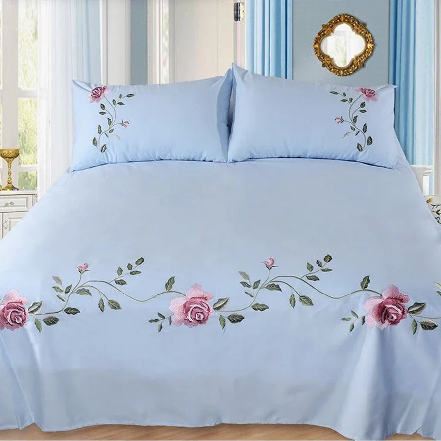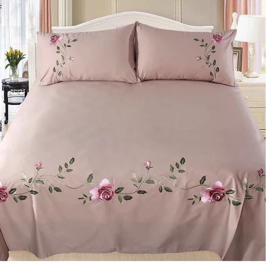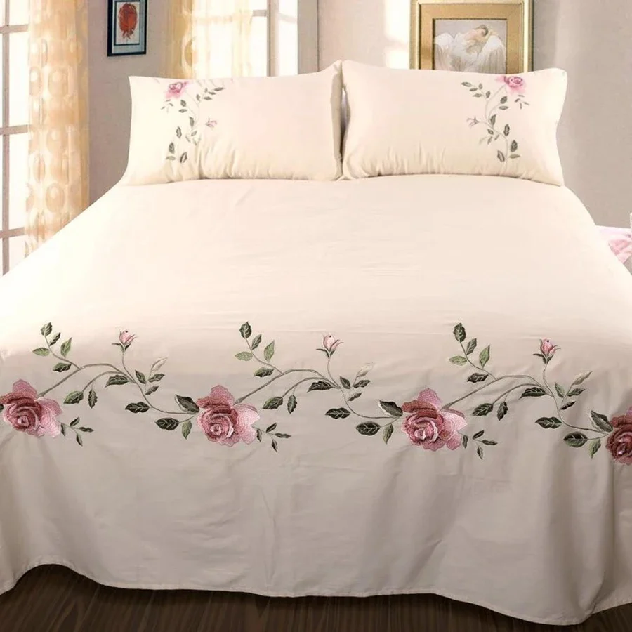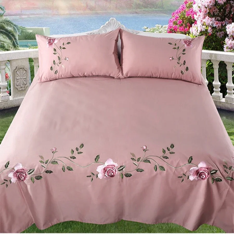 WASART Rose flora broderie design drap plat couleur unie coton sergé lin literie luxe maison textiles reine king size